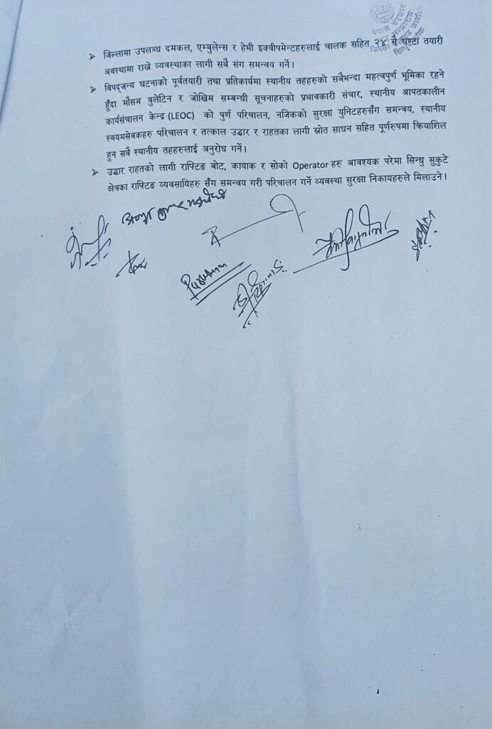 यस्तै, जरुरी परेमा उद्धारका लागि सिन्धु–सुकुटे क्षेत्रमा रहेका राफ्टिङ व्यवसायीहरूको बोट, कायाक र तिनका चालकसमेत सुरक्षा निकायसँग समन्वय गरी परिचालन गर्ने व्यवस्था मिलाइने भएको छ ।