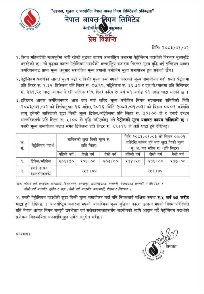 विज्ञप्ति अनुसार डिजेल र मट्टितेलमा प्रतिलिटर ३० रुपैयाँ र हवाई इन्धन (आन्तरिकतर्फ) मा प्रतिलिटर ५ रुपैयाँ वृद्धि गरिएको छ । यद्यपि, पेट्रोलको मूल्य भने हाललाई यथावत् राखिएको निगमले जनाएको छ ।