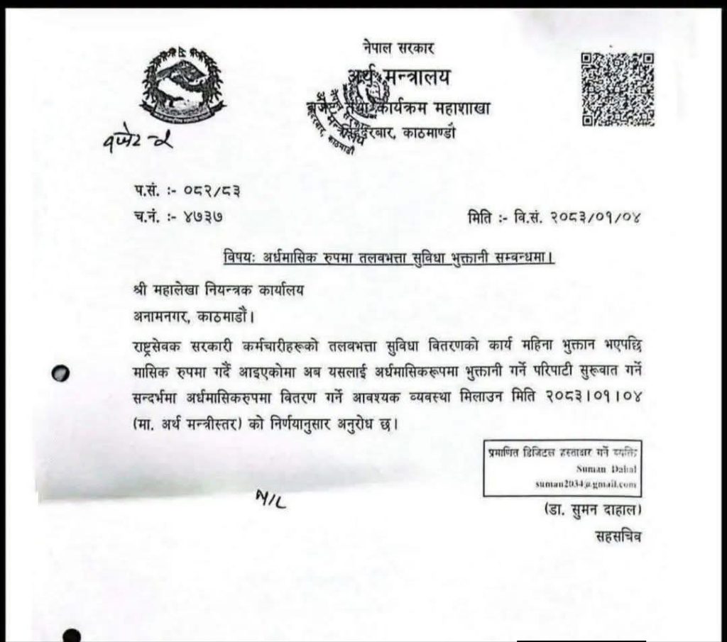 नेपाल सरकारको अर्थ मन्त्रालय अन्तर्गत बजेट तथा कार्यक्रम महाशाखाले सरकारी कर्मचारीहरूको तलब भुक्तानी प्रणालीमा परिवर्तन गर्ने निर्णय गरेको छ। मन्त्रालयले जारी गरेको आधिकारिक पत्रअनुसार अबदेखि राष्ट्रसेवक कर्मचारीहरूको तलब मासिक नभई अर्धमासिक (महिनामा दुई पटक) रूपमा वितरण गर्ने प्रक्रिया अघि बढाइएको छ।